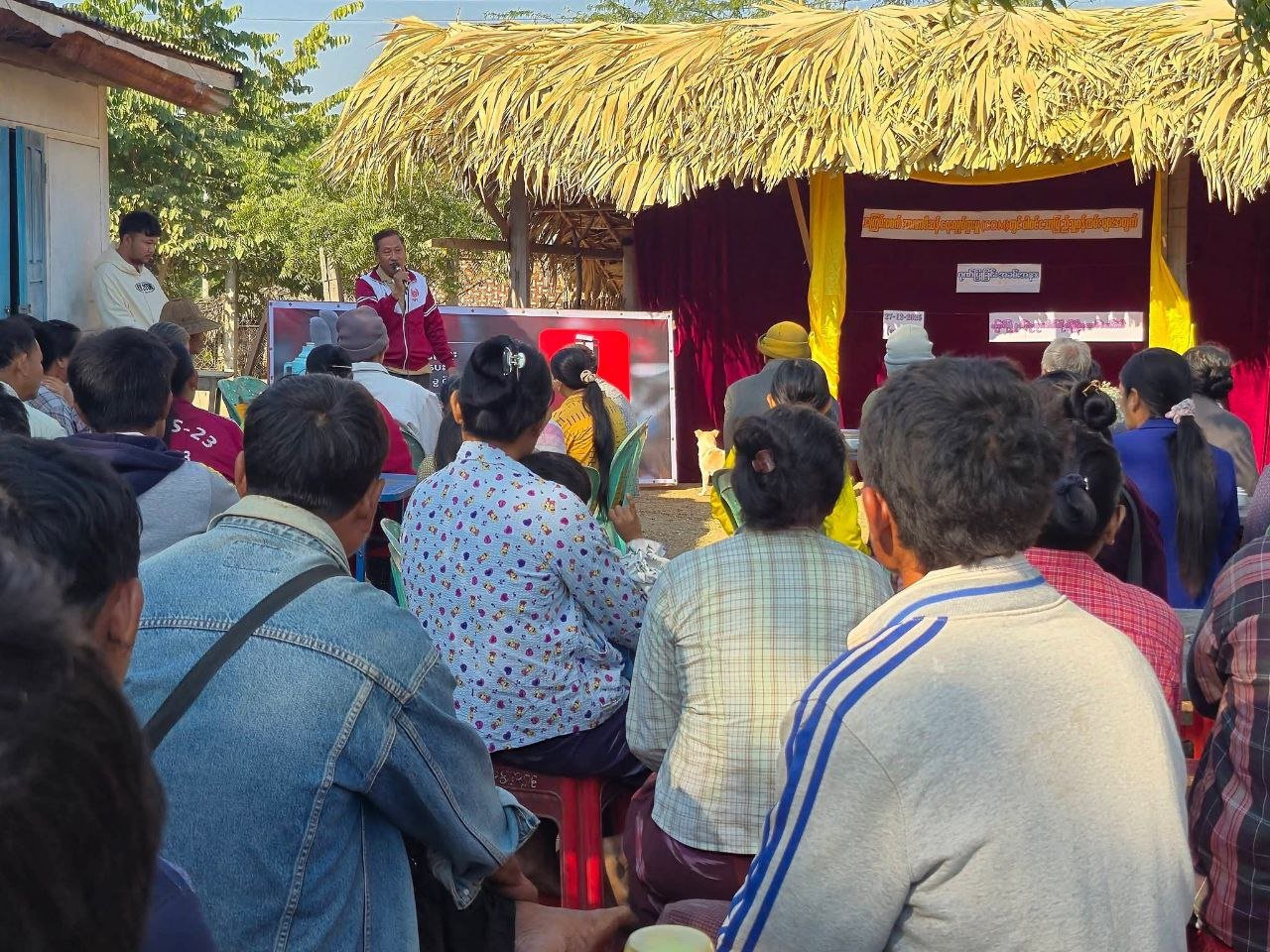 မြောင်မြို့ပေါ်မှာ ဒီဇင်ဘာလ ၂၇ ရက်နေ့က ဗိုလ်ချုပ်ကြေးရုပ်ရှေ့မှာ “အတုအယောင်ရွေးကောက်ပွဲ မဲမပေးကြေး”ဆိုတဲ့ စာသားပါဆိုင်းဘုတ်ကိုထောင်ခဲ့တာပါ။