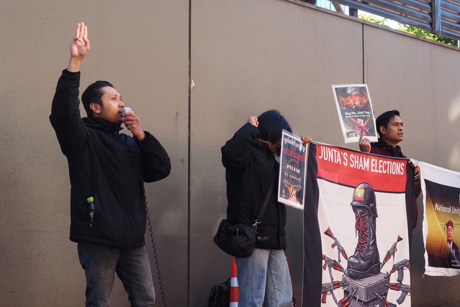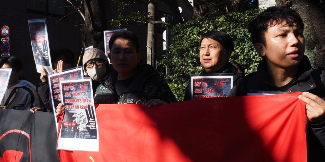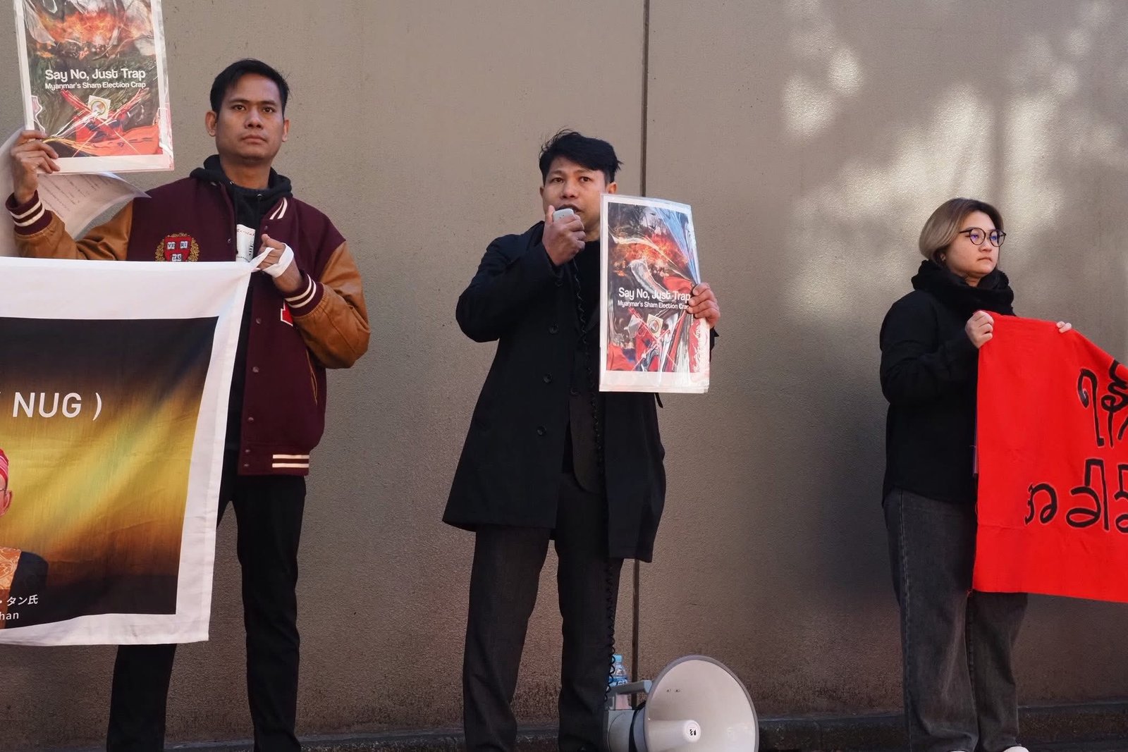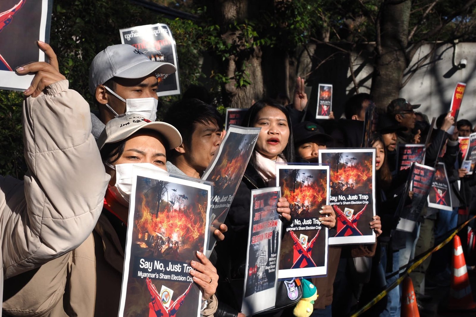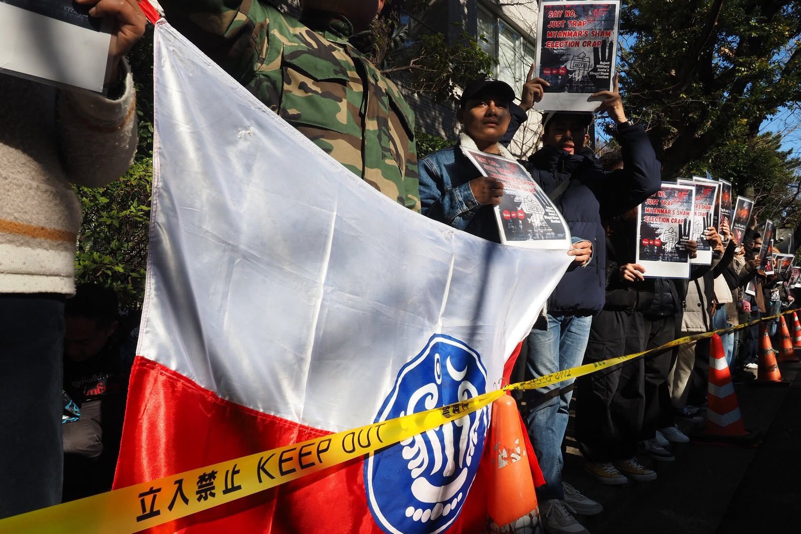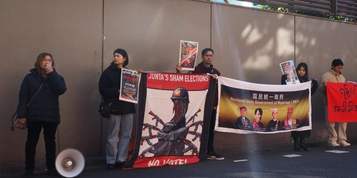 စစ်ကော်မရှင်တပ်ပြုလုပ်နေတဲ့ ရွေးကောက်ပွဲကို ကန့်ကွက်ကြောင်းဂျပန်ရောက်မြန်မာတွေ စစ်အခွန်ရုံးရှေ့မှာဆန္ဒပြနေကြပါတယ်။