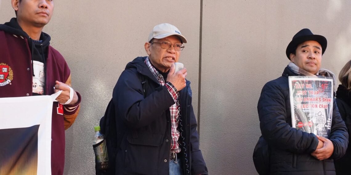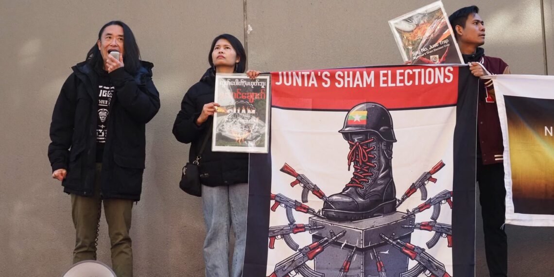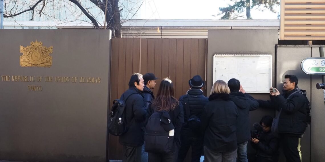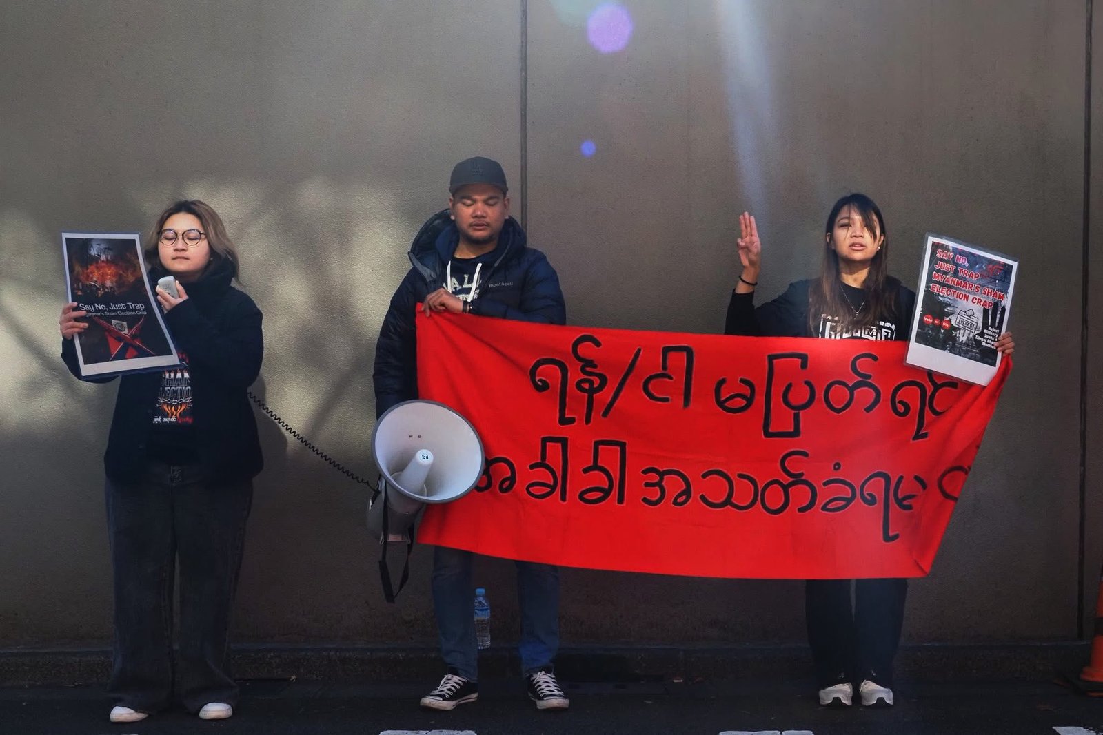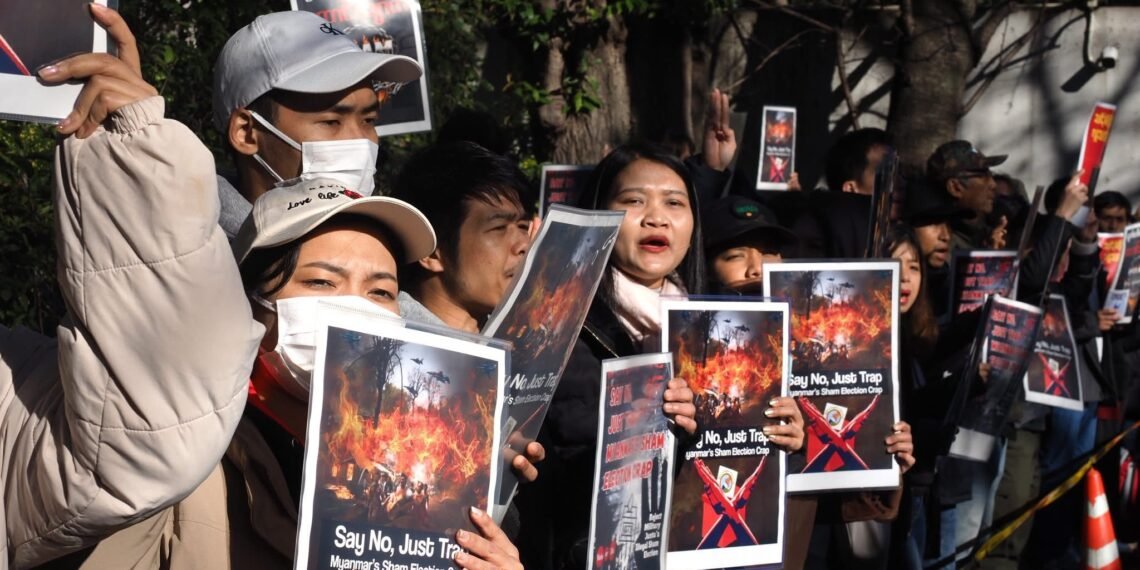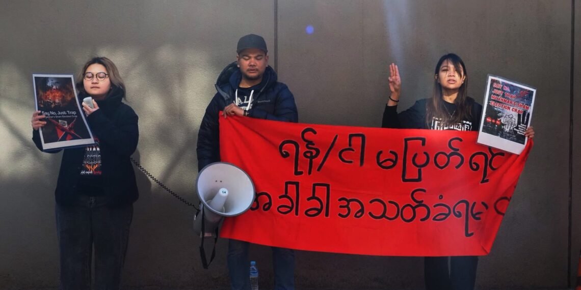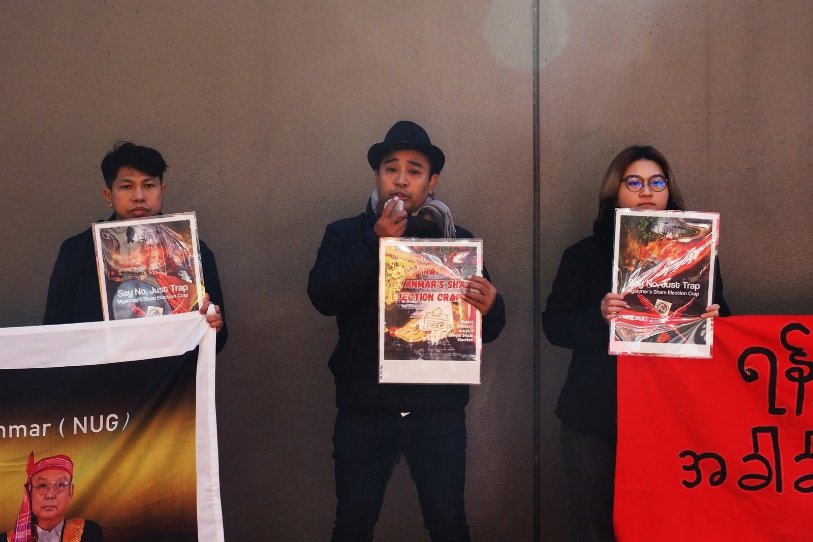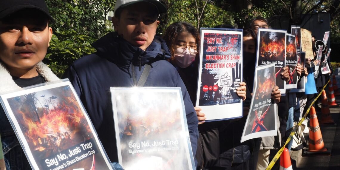 စစ်ကော်မရှင်တပ်ပြုလုပ်နေတဲ့ ရွေးကောက်ပွဲကို ကန့်ကွက်ကြောင်းဂျပန်ရောက်မြန်မာတွေ စစ်အခွန်ရုံးရှေ့မှာဆန္ဒပြနေကြပါတယ်။