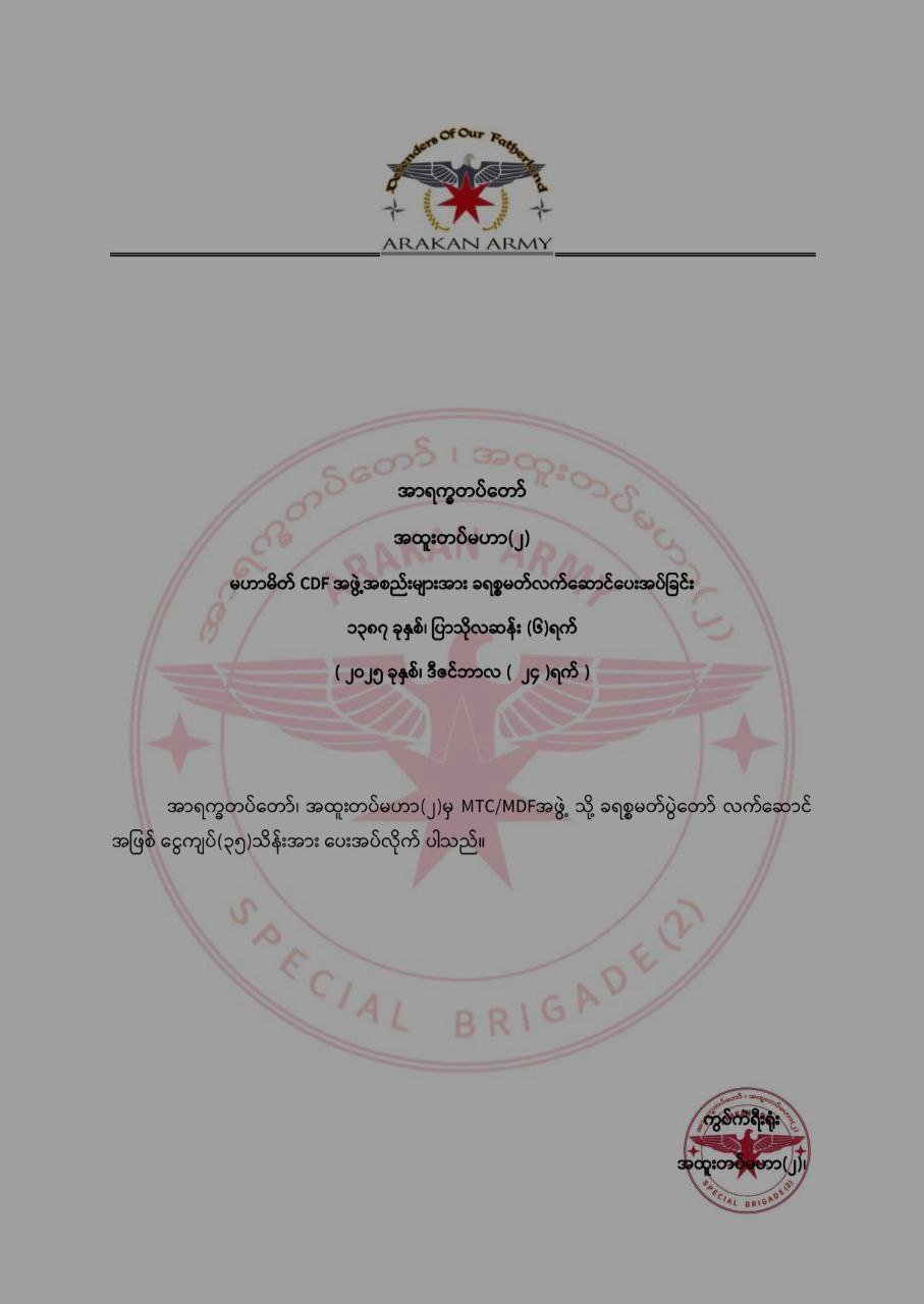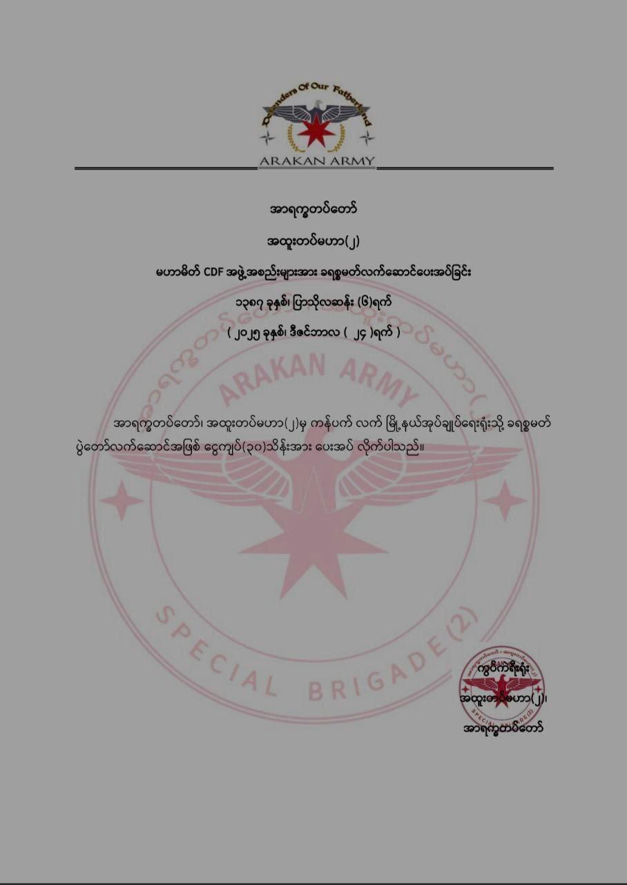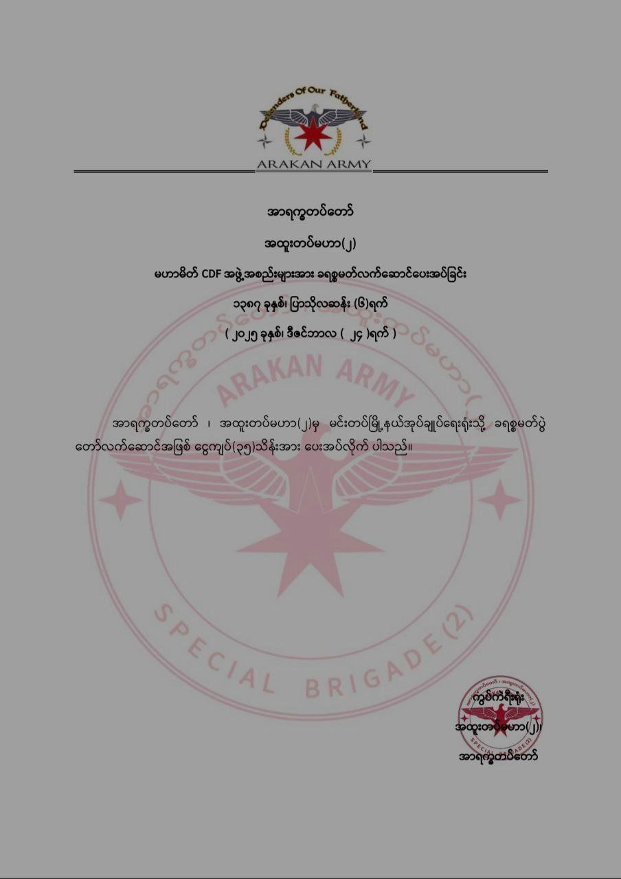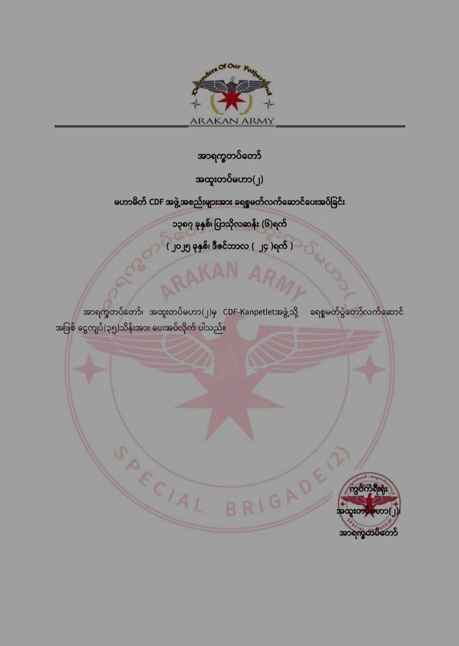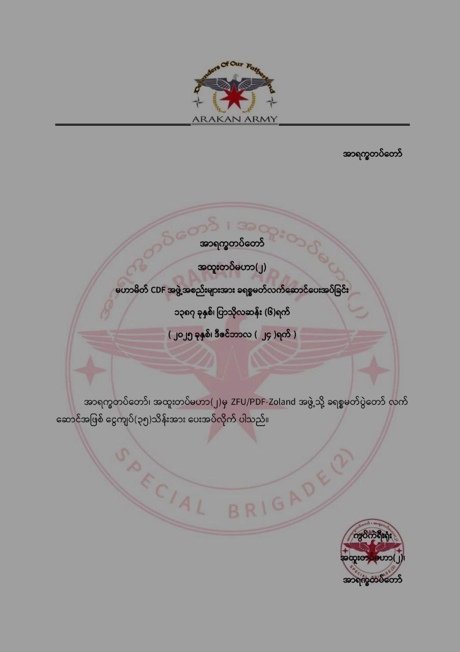 အာရက္ခတပ်တော်ရဲ့ မဟာမိတ်တော်လှန်ရေးတပ်ဖွဲ့တွေဖြစ်တဲ့CDF-Mindat၊CDF- Matupi၊CDF-Kanpetlet၊CDF- Daai၊ MTC/MDF(Mra)၊ CNO/CNDF၊ ZFU/ PDF-Zoland၊ CPU/CPA အဖွဲ့တွေကို ခရစ္စမတ်လက်ဆောင်တွေပေးခဲ့တာပါ။