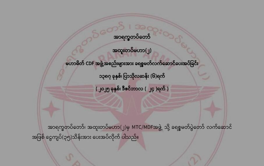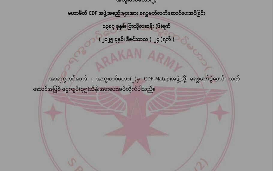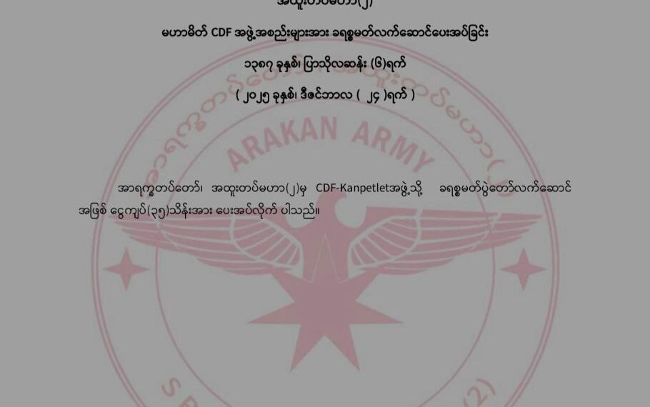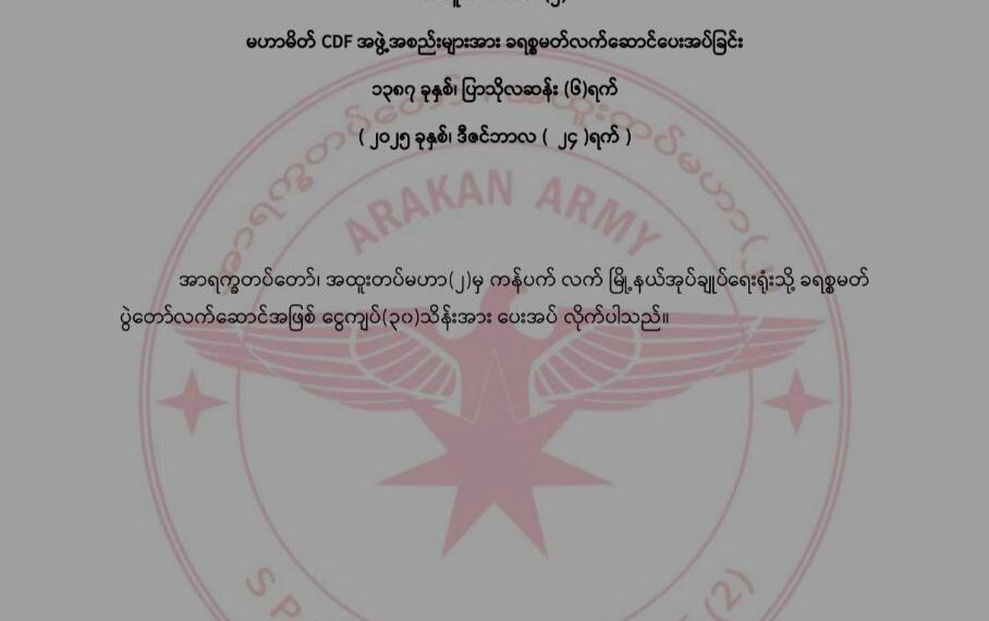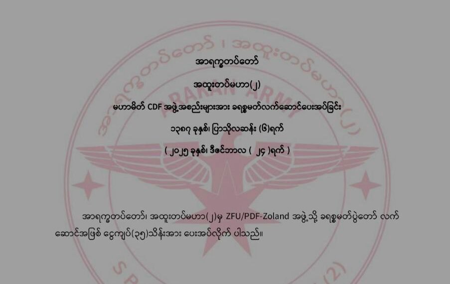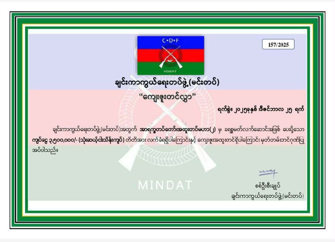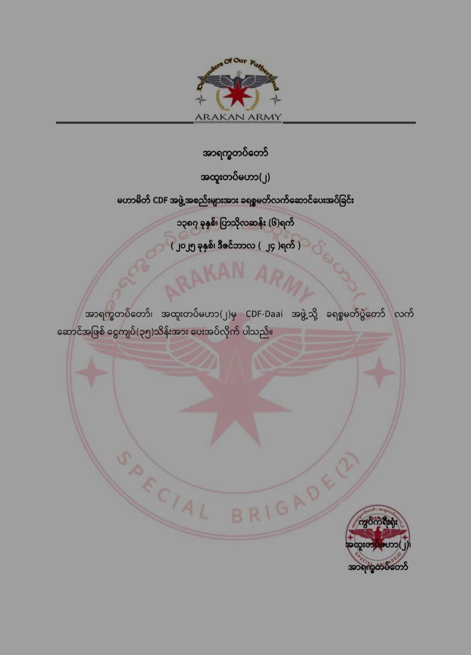 အာရက္ခတပ်တော်ရဲ့ မဟာမိတ်တော်လှန်ရေးတပ်ဖွဲ့တွေဖြစ်တဲ့CDF-Mindat၊CDF- Matupi၊CDF-Kanpetlet၊CDF- Daai၊ MTC/MDF(Mra)၊ CNO/CNDF၊ ZFU/ PDF-Zoland၊ CPU/CPA အဖွဲ့တွေကို ခရစ္စမတ်လက်ဆောင်တွေပေးခဲ့တာပါ။