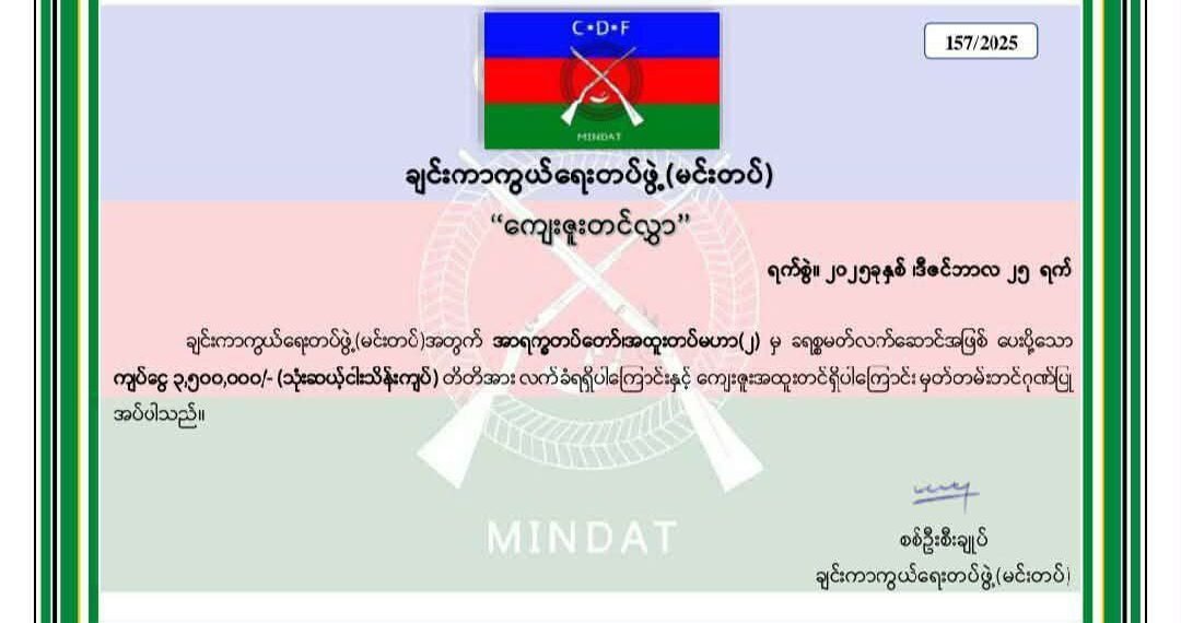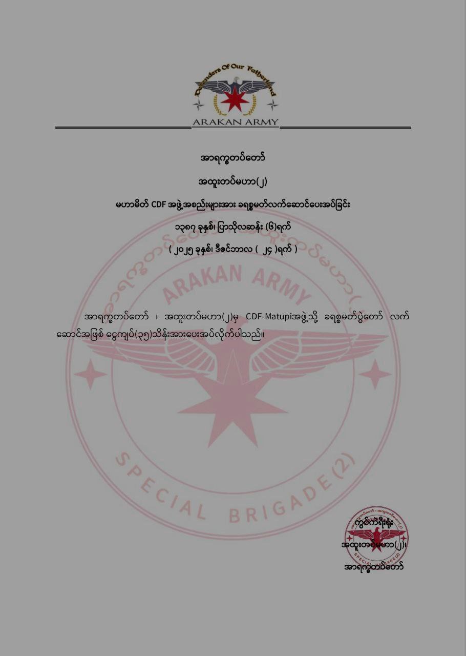 နောက်ပြီး CDF- Matupi အဖွဲ့တို့ကို နွားနှစ်ကောင်နဲ့ ဆန်အိတ်နှစ်ရာ၊ CDF-Kanpetlet အဖွဲ့တွေအတွက်ဆန်အိတ်တရာကို အာရက္ခတပ်တော်မှထပ်ပြီးပေးခဲ့ပါတယ်။