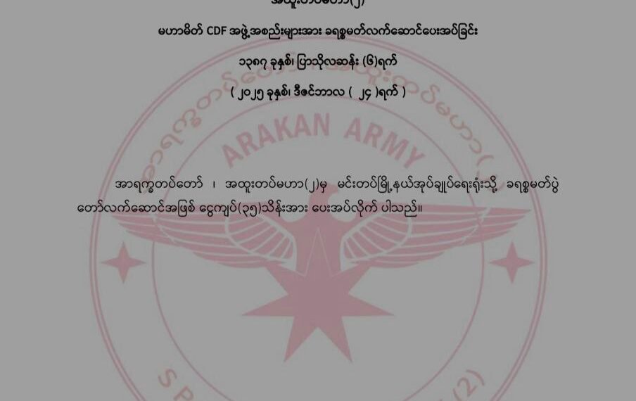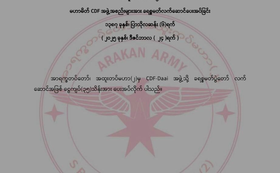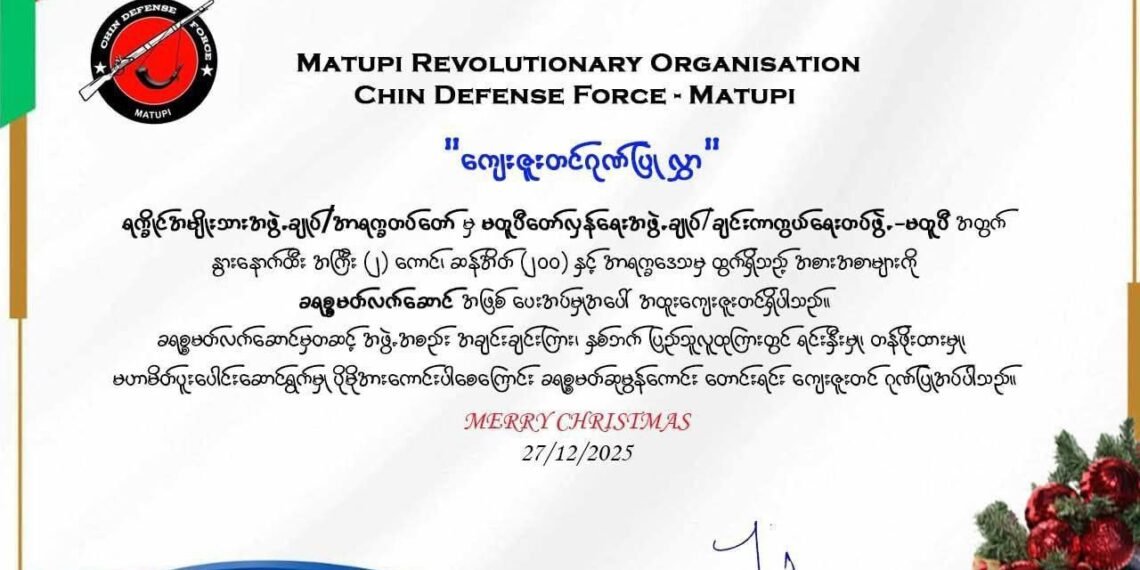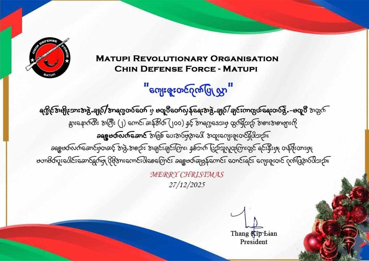 ချင်းဒေသမှာ အာရက္ခတပ်တော်(AA)မှ ချင်းတော်လှန်ရေးတပ်ဖွဲ့ရှစ်ဖွဲ့နဲ့ ဘာသာရေး၊ လူမှုရေးအသင်းအဖွဲ့ခြောက်ဖွဲ့ကို ခရစ္စမတ်လက်ဆောင်တွေပေးခဲ့ပါတယ်။