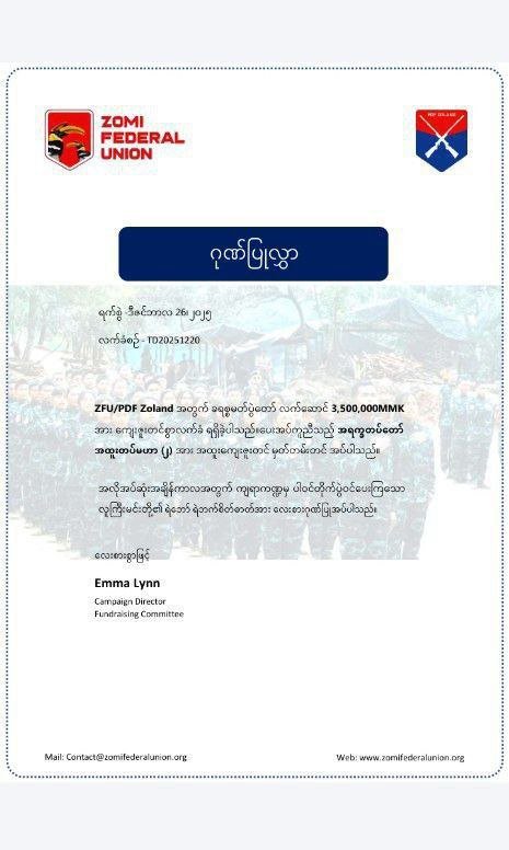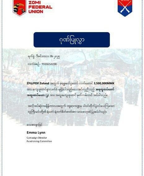 အဲဒီချင်းတော်လှန်ရေးဖွဲ့တွေအတွက် တဖွဲ့ကိုငွေကျပ် သုံးဆယ်ငါးသိန်းထိ ခရစ္စမတ်လက်ဆောင်အဖြစ် ဒီဇင်ဘာလ ၂၄ ရက်နေ့မှာပေးခဲ့ပြီး ဆုတောင်းမေတ္တာပို့သခဲ့တယ်လို့ဆိုပါတယ်။