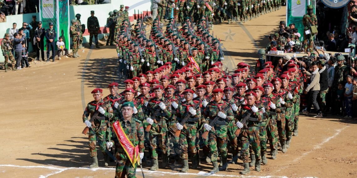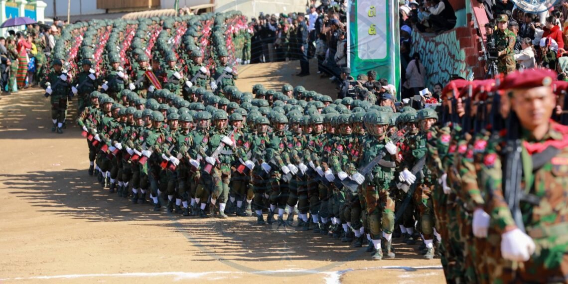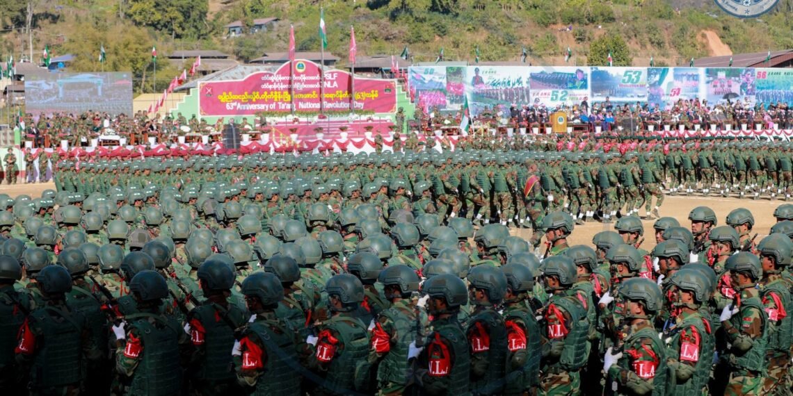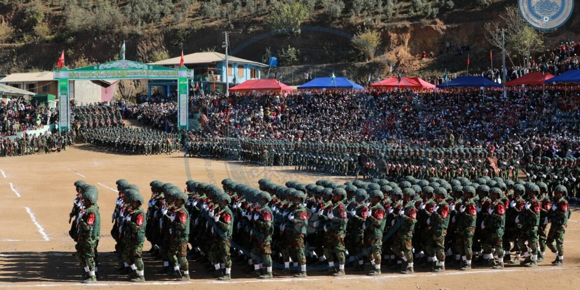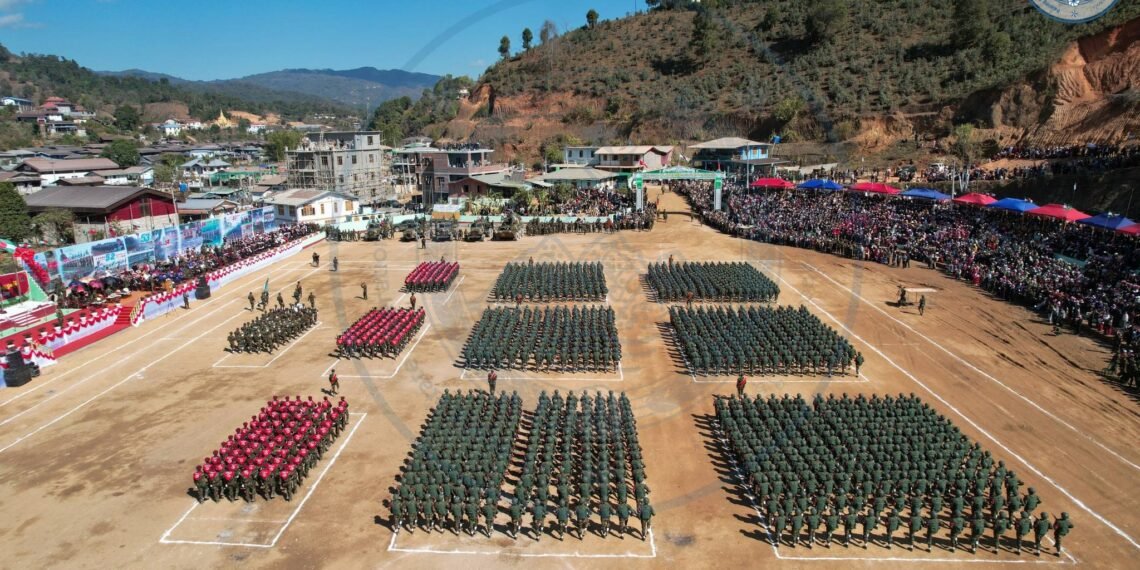 ​အဲဒီအခမ်းအနားမှာ TNLA စစ်သည်တော် အင်အားတထောင့်ငါးရာကျော်က စစ်ကြောင်းဆယ့်ငါးကြောင်းခွဲပြီး စစ်ရေးပြချီတက်ခဲ့ကြသလို ဂုဏ်ပြုစစ်ကြောင်းတွေကလည်း စစ်ရေးပြသရုပ်ဖော်ခဲ့ကြပါတယ်။