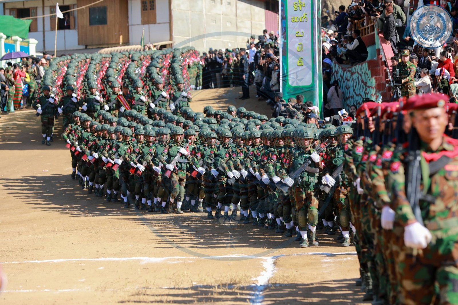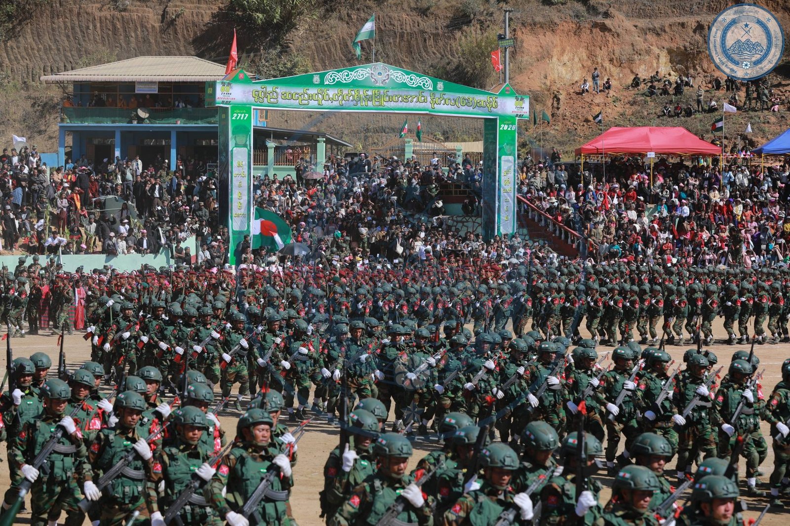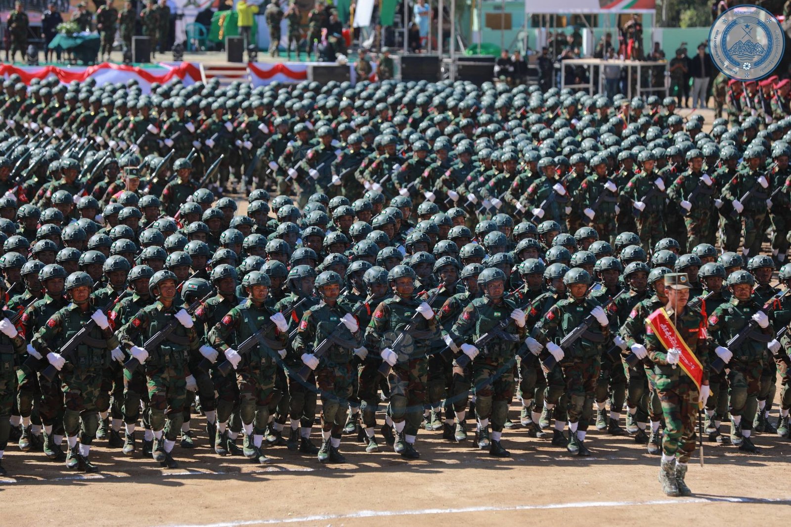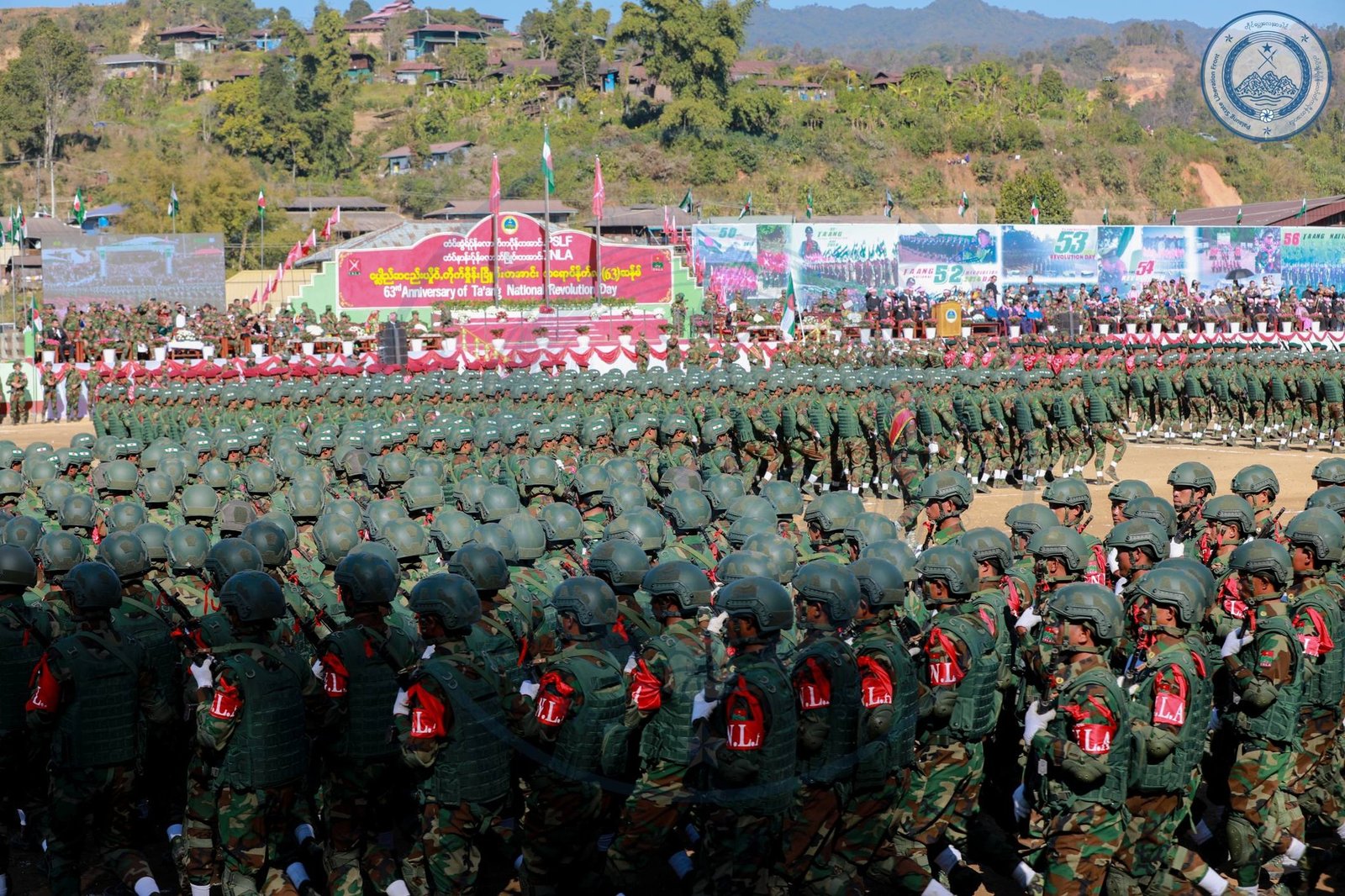 ​အဲဒီအခမ်းအနားမှာ TNLA စစ်သည်တော် အင်အားတထောင့်ငါးရာကျော်က စစ်ကြောင်းဆယ့်ငါးကြောင်းခွဲပြီး စစ်ရေးပြချီတက်ခဲ့ကြသလို ဂုဏ်ပြုစစ်ကြောင်းတွေကလည်း စစ်ရေးပြသရုပ်ဖော်ခဲ့ကြပါတယ်။