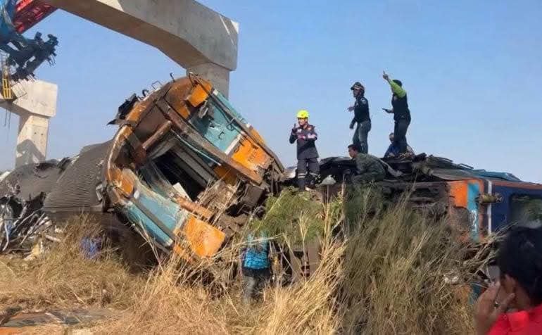 ထိုင်းနိုင်ငံ၊ စီခီယိုခရိုင် (Sikhiu) အတွင်းရှိ ရထားလမ်းပေါ်သို့ ဆောက်လုပ်ရေးကရိန်းတခုပြုတ်ကျရာမှ ခရီးသည်တင်ရထားနဲ့တိုက်မိပြီး လူနှစ်ဆယ့်ခုနှစ်ဦးသေဆုံးကာ ငါးဆယ့်ငါးဦးဒဏ်ရာရသွားတယ်လို့ ဘန်ကောက်ပို့စ်သတင်းမှ သိရပါတယ်။