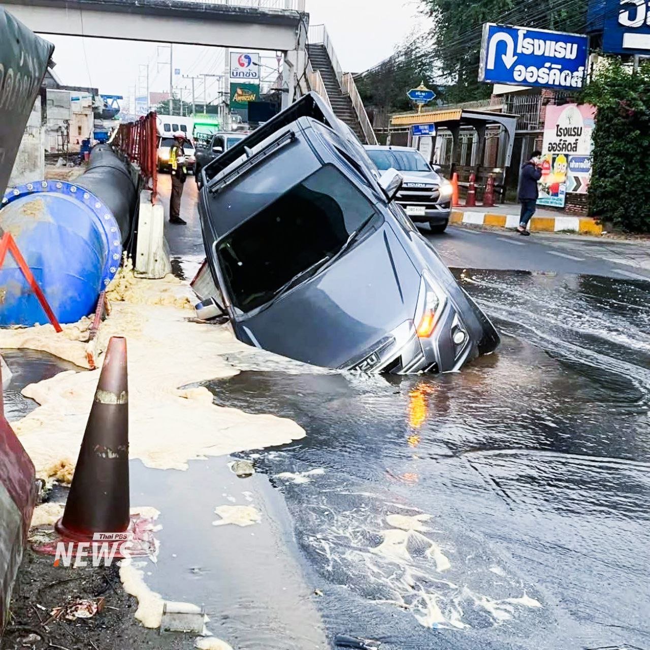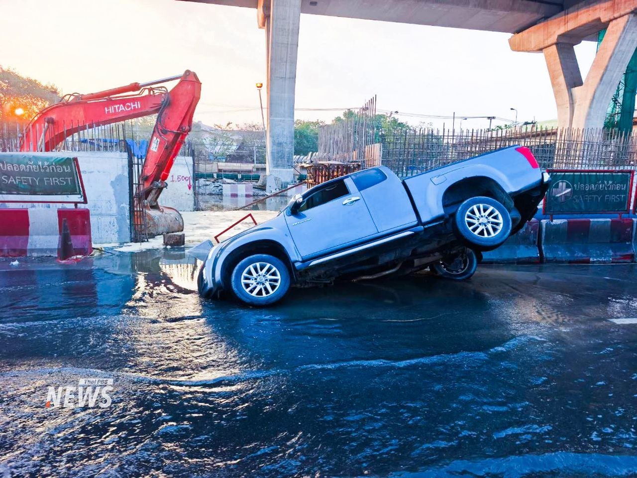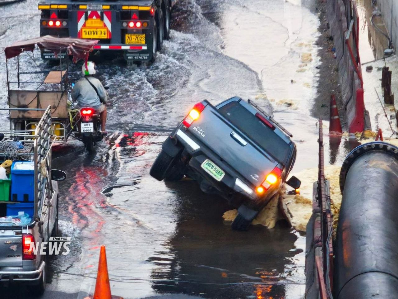 ဘန်ကောက်မြို့အဝင် ရာမ-၂ လမ်းမှာ ဇန်နဝါရီလ ၁၇ ရက်၊ ဒီနေ့မနက်ပိုင်းက မြေအောက်ရေပိုက်ပေါက်ပြီး လမ်းကျွံကျခဲ့တာကြောင့် ပစ်ကပ်ကားတစ်စီး ကျင်းထဲထိုးကျသွားတဲ့ ဖြစ်စဉ်တခု ဖြစ်ပွားခဲ့ပါတယ်။