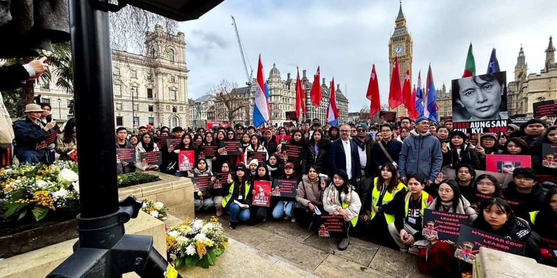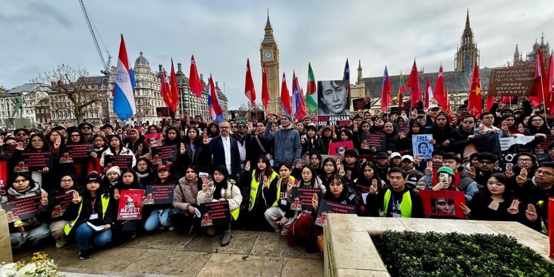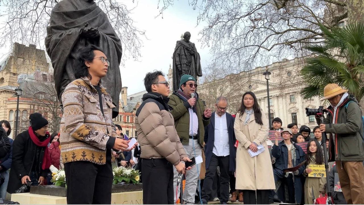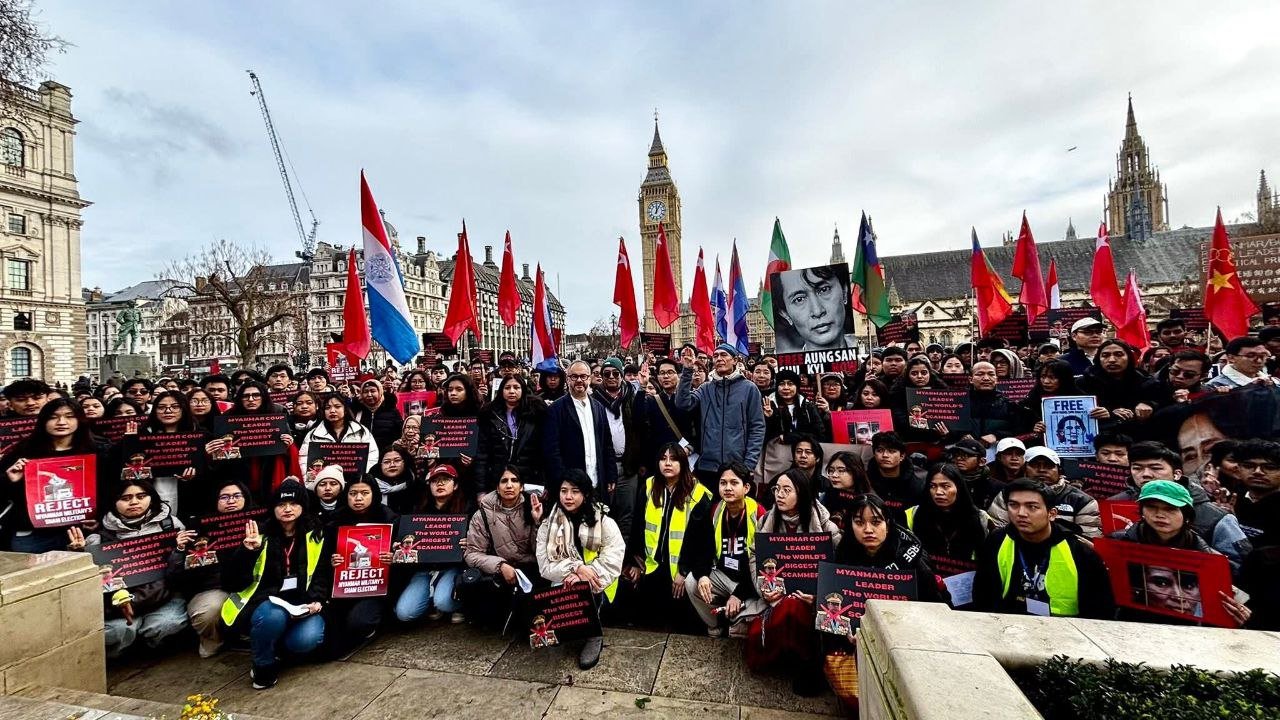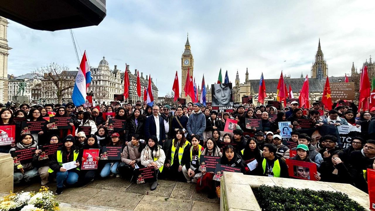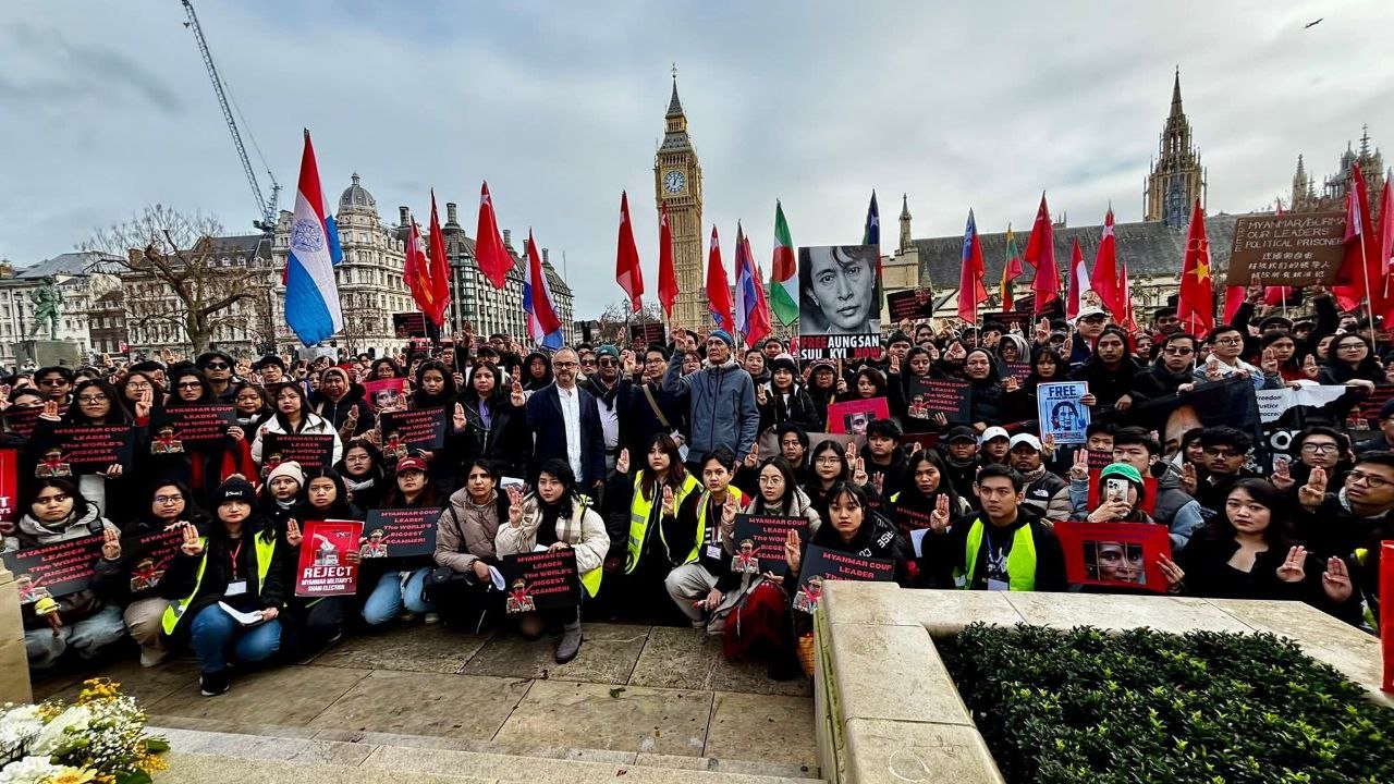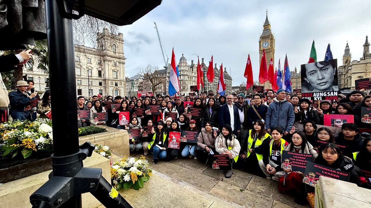 လန်ဒန်မြို့ပါလီမန်ရှေ့မှာ ဖေဖော်ဝါရီ ၁ရက်၊ မနေ့ကကျရောက်တဲ့ နွေဦးတော်လှန်ရေးငါးနှစ်ပြည့်ဆန္ဒပြပွဲကို ကျင်းပခဲ့ပါတယ်။