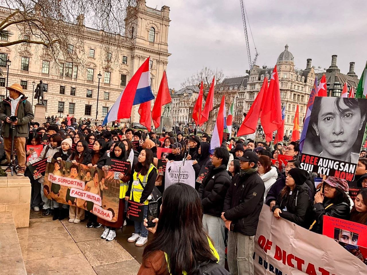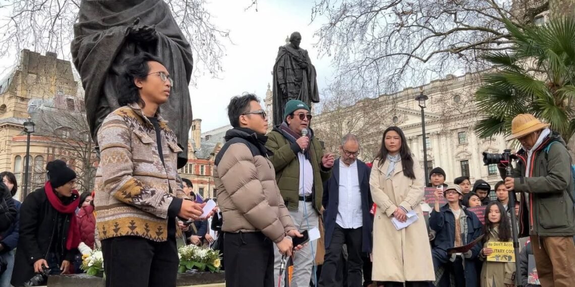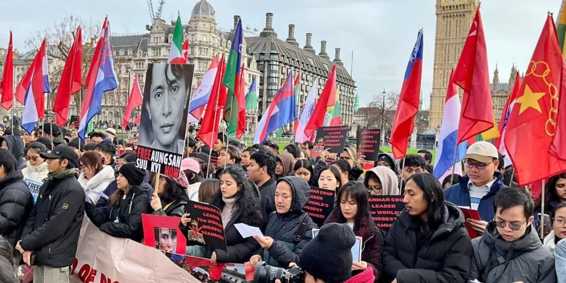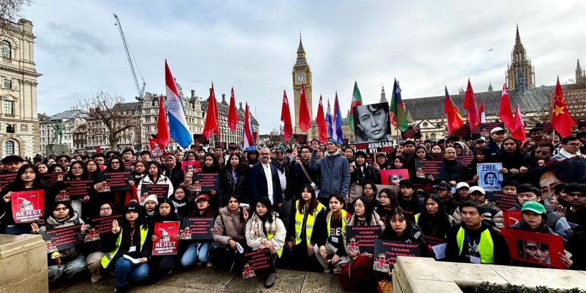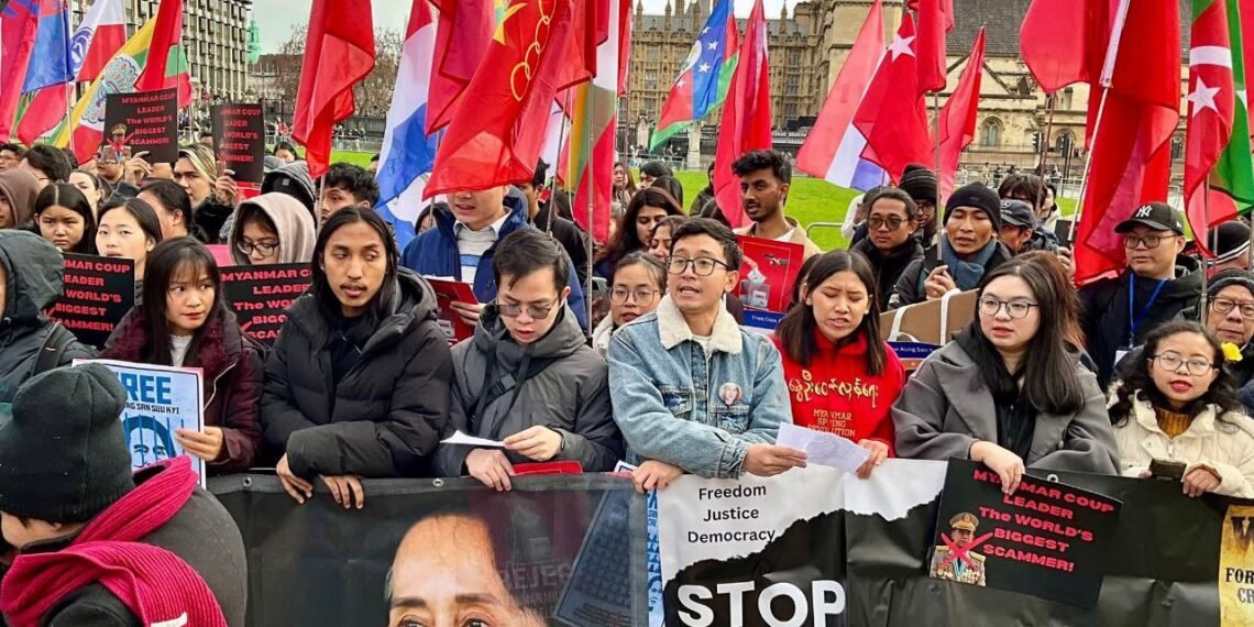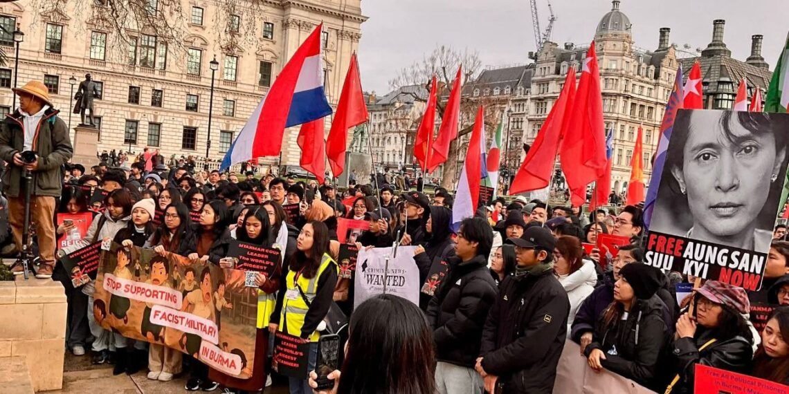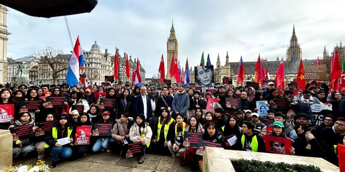 လန်ဒန်မြို့ပါလီမန်ရှေ့မှာ ဖေဖော်ဝါရီ ၁ရက်၊ မနေ့ကကျရောက်တဲ့ နွေဦးတော်လှန်ရေးငါးနှစ်ပြည့်ဆန္ဒပြပွဲကို ကျင်းပခဲ့ပါတယ်။