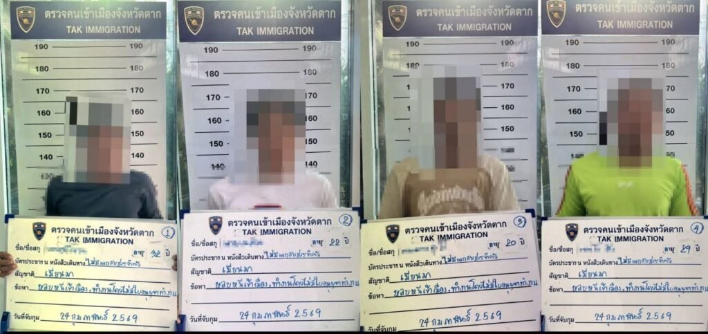 မဲဆောက်မြို့မှာတရားမဝင်ဝင်ရောက်နေထိုင်ပြီး အလုပ်လုပ်ကိုင်နေတဲ့ မြန်မာနိုင်ငံသား ၄ ဦးကို ထိုင်းအာဏာပိုင်တွေက ဖေဖော်ဝါရီလ ၂၄ ရက်၊ မနေ့ကဖမ်းဆီးလိုက်တယ်လို့ တာ့ခ်ခရိုင်လူဝင်မှုကြီးကြပ်ရေးဌာနက ထုတ်ပြန်ထားပါတယ်။