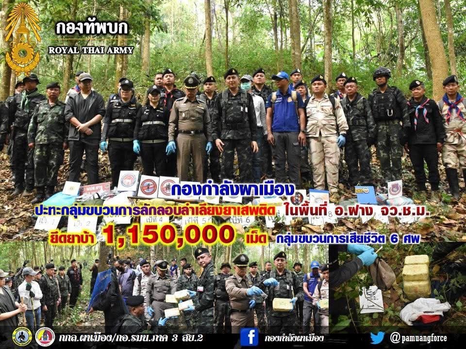 ထိုင်းနိုင်ငံ၊ချင်းမိုင်ခရိုင် ဖန်မြို့နယ်အတွင်းမှာ ထိုင်းနယ်စပ်လုံခြုံရေးတပ်ဖွဲ့နဲ့ မူးယစ်ဆေးဝါးမှောင်ခိုအဖွဲ့တို့ တိုက်ပွဲဖြစ်ပွားခဲ့ပြီး စိတ်ကြွဆေးပြား ၁ သန်းကျော်သိမ်းဆည်းရမိခဲ့တယ်လို့ ထိုင်းဘုရင့်တပ်တော်က ဧပြီလ ၁ ရက်၊ ဒီနေ့ထုတ်ပြန်ပါတယ်။