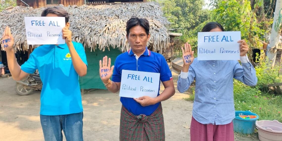 နိုင်ငံရေးအကျဉ်းသားအားလုံး လွတ်မြောက်ဖို့အတွက်ပြုလုပ်တဲ့ Blue Shirt Campaign မှာ ဆားလင်းကြီး – လက်ပံတောင်းတောင် ပင်မသပိတ်အင်အားစုတွေလည်း ဧပြီလ ၁၄ ရက်၊ မနေ့ကပါဝင်လှုပ်ရှားခဲ့ကြပါတယ်။