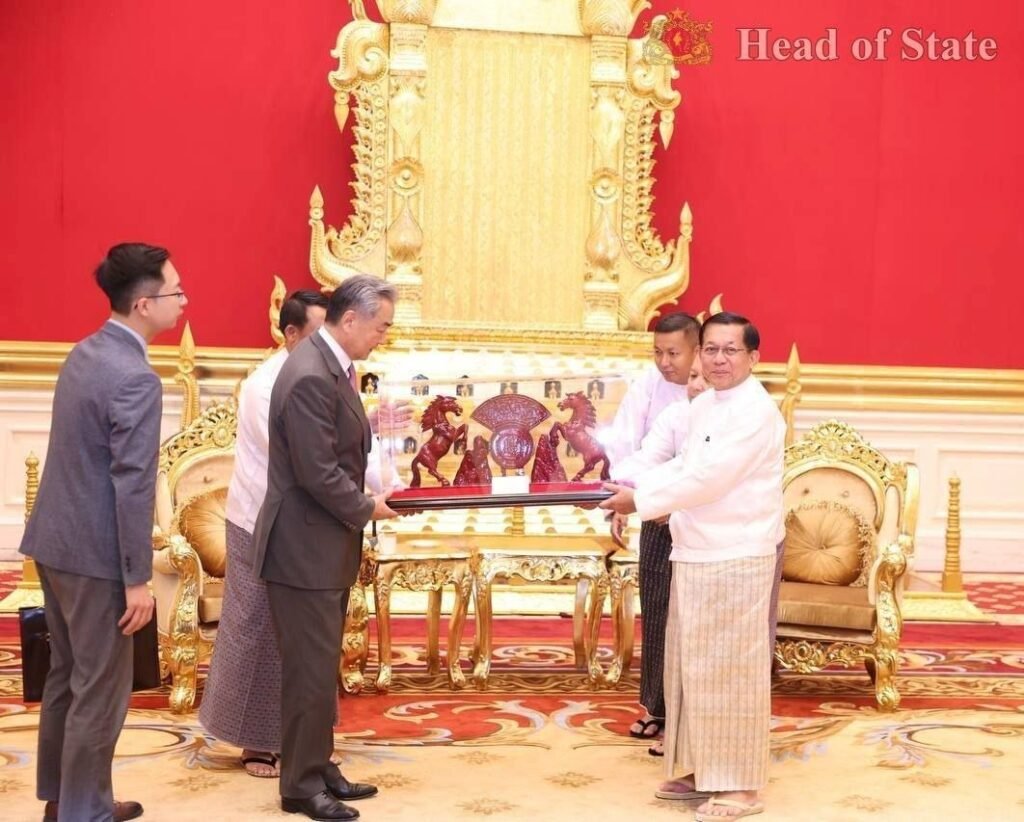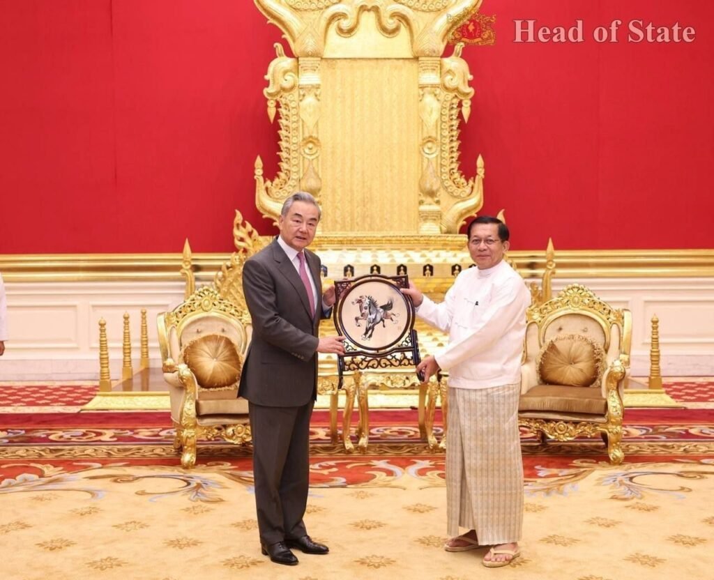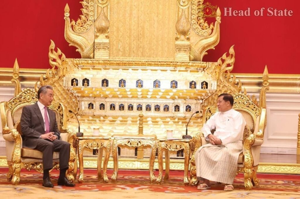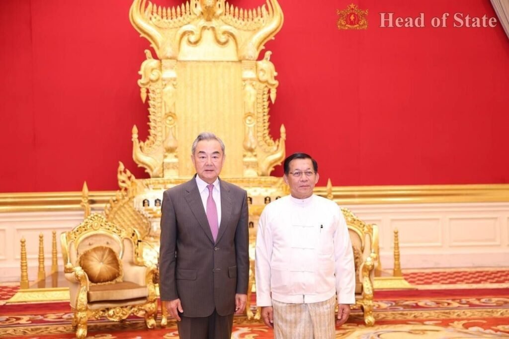 တရုတ်နိုင်ငံခြားရေးဝန်ကြီးဝမ်ယိနဲ့ အာဏာသိမ်းစစ်ခေါင်းဆောင်မင်းအောင်လှိုင်ဟာ ဧပြီလ ၂၅ ရက်၊ ဒီနေ့နေပြည်တော်မှာတွေ့ပါတယ်။