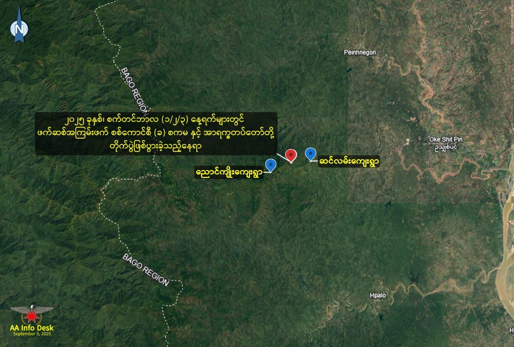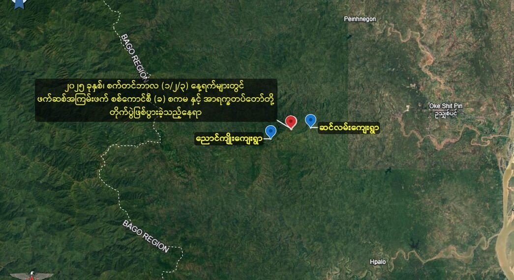 ပဲခူးတိုင်း၊ ပန်းတောင်မြို့နယ်၊ ဆင်လမ်ကျေးရွာအနောက်ဘက် ၂ ကီလိုမီတာ နဲ့၁.၇ကီလိုမီတာအကွာမှာ တိုက်ပွဲတွေဖြစ်နေတယ်လို့ ဆိုပါတယ်။